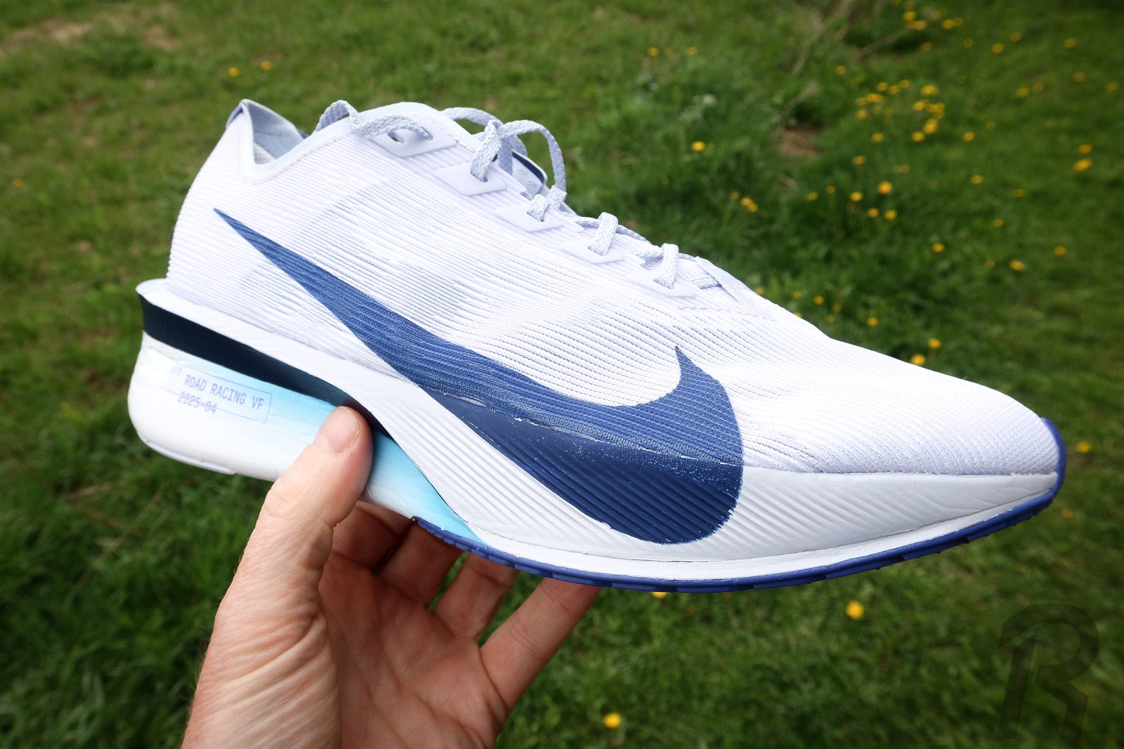 À l’autre extrémité du spectre, j’ai aussi reçu la Nike Vaporfly 4. Clairement une chaussure taillée pour la performance. À 171 grammes sur la balance, on est sur du très léger. La mousse PEBA est bien présente, associée à une plaque carbone visible grâce à un design creusé sous la chaussure (la mousse est évidée).