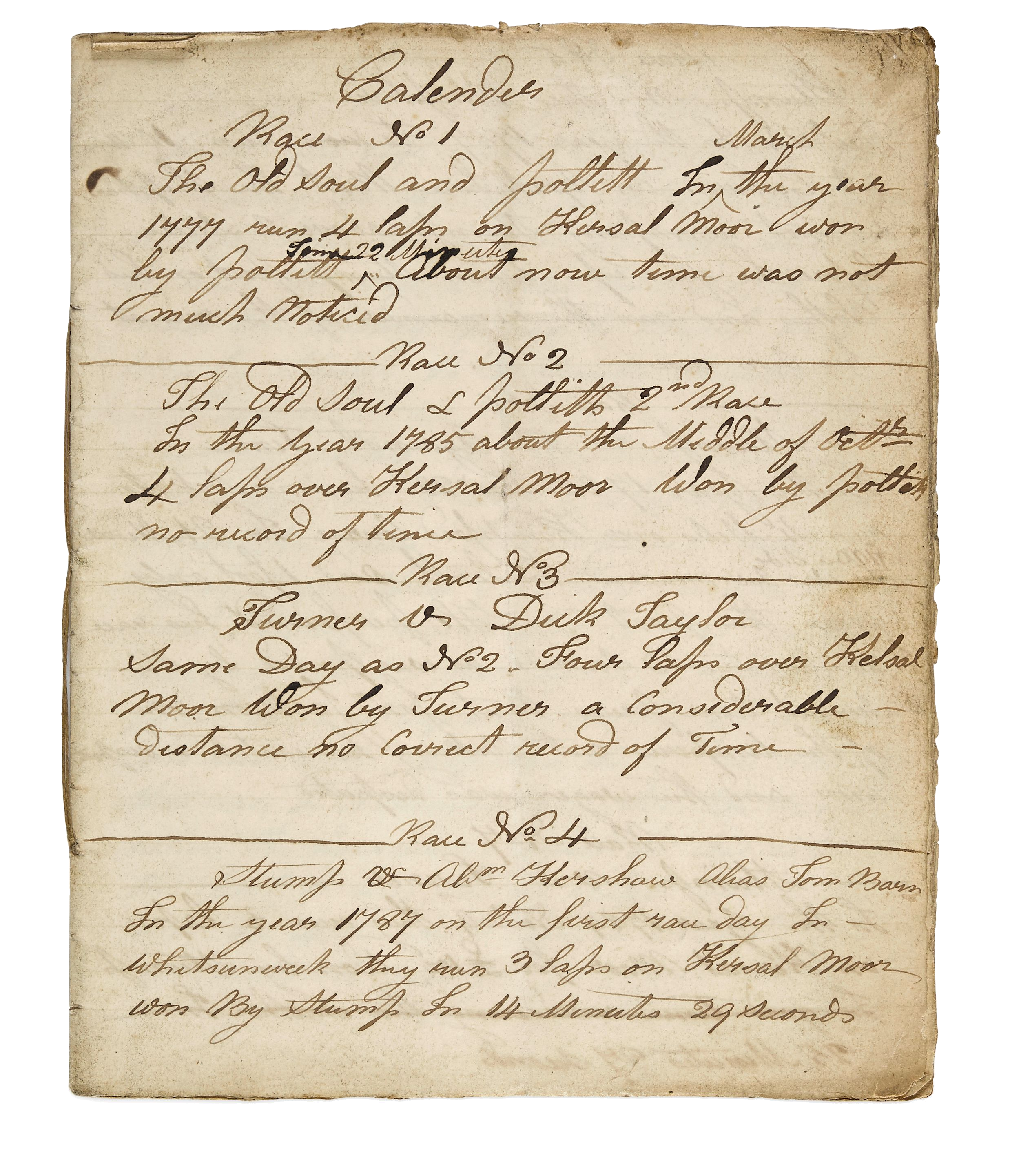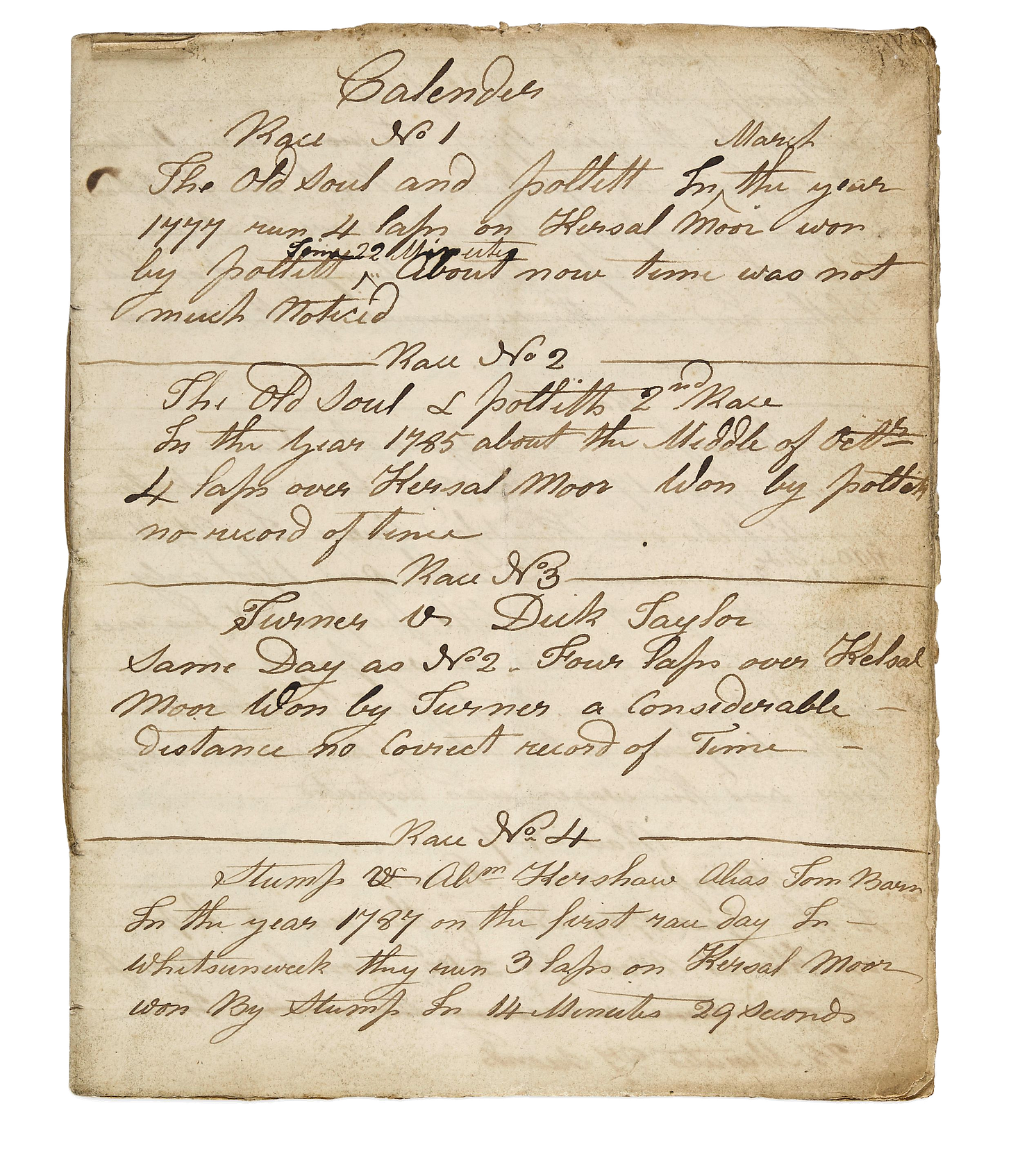 « Manuscrit autographe, s’agissant d’un catalogue (intitulé “Calendrier”) de 35 courses d’hommes nus tenues sur Kersal Moor entre 1777 et 1811.... Remontant au moins au milieu du XVIIe siècle, l’étrange coutume de la course de montagne (”fell running”) nue s’est poursuivie jusqu’au milieu du XIXe siècle. Selon le romancier du Lancashire Walter Greenwood, la coutume venait de la Grèce antique, et servait “pour que les filles puissent juger de la forme”. Ce petit carnet répertorie une série de 35 courses entre 1777 et 1811, incluant les noms des coureurs (et leurs surnoms) ainsi que, dans la plupart des cas, les temps, les distances et les montants misés, ainsi que des observations sur les courses. Une représentation intéressante d’un passe-temps étrange, mais attachant. »
