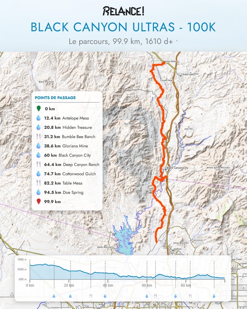 Le parcours de 100 km emprunte le Black Canyon National Recreation Trail, un tracé historique autrefois utilisé par les populations amérindiennes et les diligences. Si le profil semble “facile” sur papier avec une perte d’altitude nette, il s’avère trompeur : la première moitié est roulante, mais la seconde concentre l’essentiel des 1600m de dénivelé positif dans un terrain plus technique et rocailleux. Attention, la technicité reste toutefois celle d’un trail américain, c’est à dire plutôt modérée au regard des critères européens.