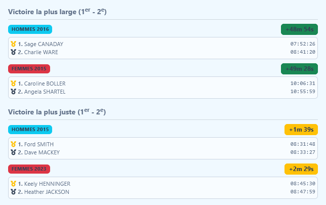 Chez les femmes, le plateau était digne d’un championnat du Monde avec la présence de Molly Seidel (médaillée de bronze olympique sur marathon), Abby Hall (vainqueure Western States 2025), Anne Flower (recordwoman du 50 miles). Jennifer Lichter, qui s’alignait pour la première fois sur cette distance avec un nouvel entraîneur et sponsor, a réalisé une performance de haut vol avec un chrono de 7:57:05, pulvérisant le record précédent de près de 20 minutes.