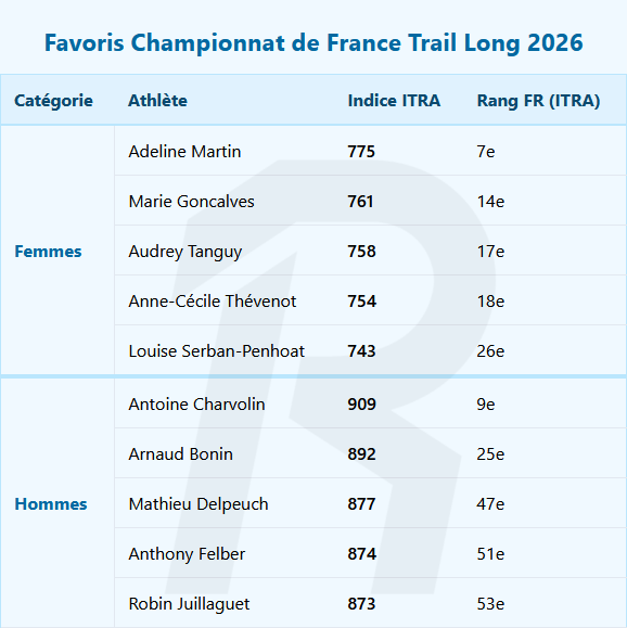 Ce week-end ont lieu les France de Trail 2026. Parmi les champions de France 2025 (Roubiol, Gerardi, Tranchand, Jarrouseau), seul Benjamin Roubiol répond présent en changeant de format : long vers court. Au-delà, le niveau athlétique des « favoris » identifiés avant l’édition 2026 n’est peut-être pas au niveau de l’événement (cf notre tableau ci-dessus).