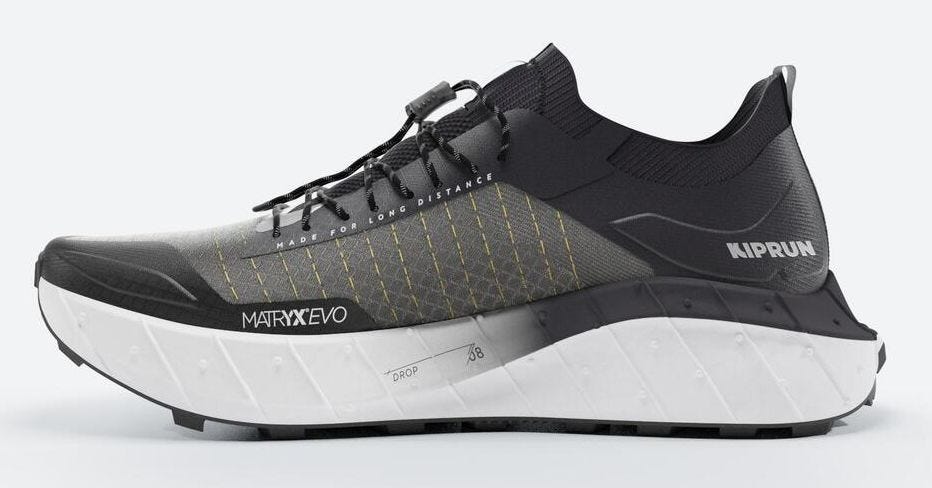 Kiprun présente les Race Ultra 2 (typées perf, on va dire). La semelle intermédiaire passe au VFOAM+ (procédé SCF) mêlant 90 % d’EVA et 10 % de PEBA. Amorti annoncé en hausse de 38 % et retour d’énergie de +10 %. Le stack est porté à 36/28 mm pour un drop de 8 mm (encore une marque qui augmente le drop). Côté tige, ça évolue sur du Matryx Evo, avec un col-chaussette et un laçage Quicklace (je n’aime pas le Quicklace). Crampons de 5 mm, poids annoncé à 280 g en 42. Prévue en octobre au prix de 149,99 €. Sur le papier, le compromis amorti/réactivité progresse face à la V1.